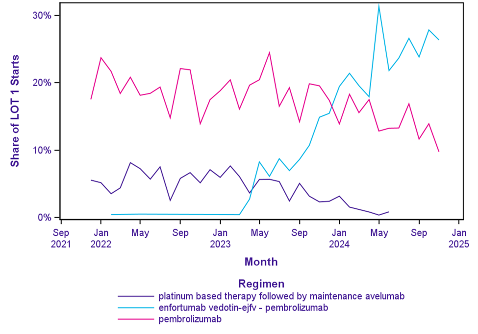 With initial FDA approval in April 2023 for patients who were platinum ineligiblei followed by expansion to all first-line metastatic patientsii in December 2023, the enfortumab vedotin-ejfv – pembrolizumab combination share of LOT 1 starts grew rapidly to 26% by November 2024 (Figure 2). This also corresponds with a decline in other ICI therapies over the same period.