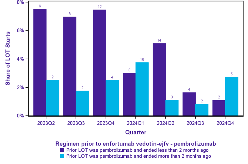 Note: Quarters before 2023 are not displayed. The last quarter only includes 2 months. Bars are labeled with raw counts. Denominator is enfortumab vedotin-ejfv – pembrolizumab starts.